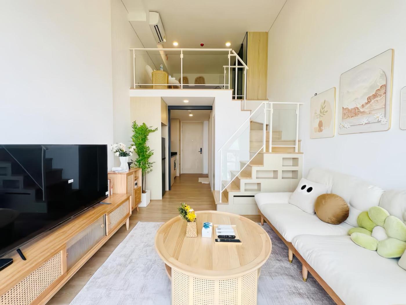 One-bedroom Loft Apartment. The air-conditioned apartment has 1 bedroom and 1 bathroom with a shower and a bidet. Guests can make meals in the kitchen that features a stovetop, a refrigerator, kitchenware and an electric kettle. The apartment features a washing machine, a seating area, a dining area, a sofa and a flat-screen TV. The unit has 1 bed. ;