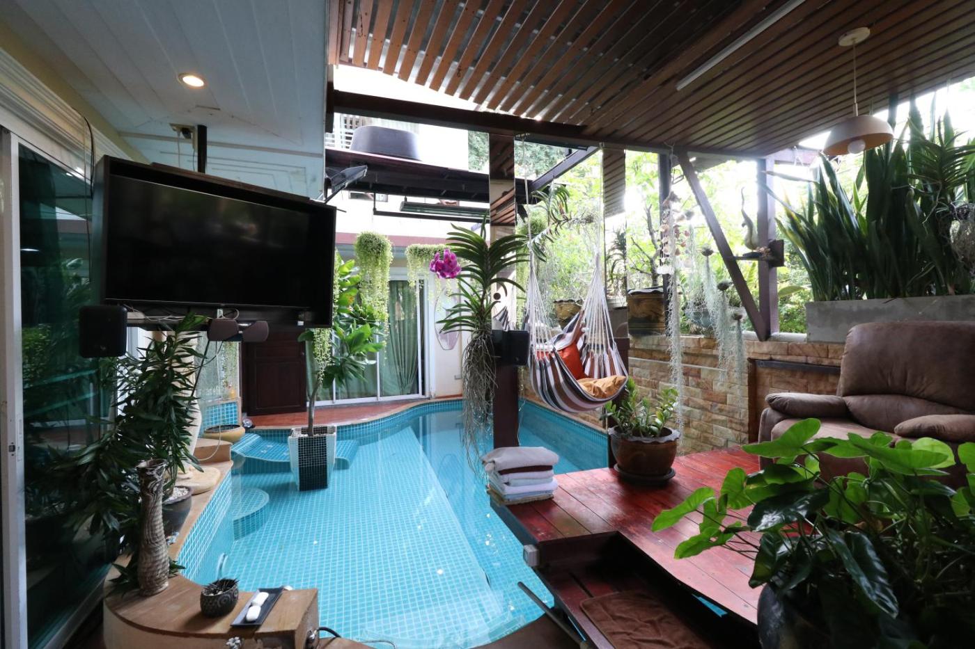 Three-Bedroom House. The private pool is the standout feature of this holiday home. Meals can be prepared in the well-fitted kitchen, which features a stovetop, a refrigerator, kitchenware and an oven. The spacious holiday home features air conditioning, a washing machine, a tea and coffee maker, a seating area and a flat-screen TV. The unit has 3 beds.