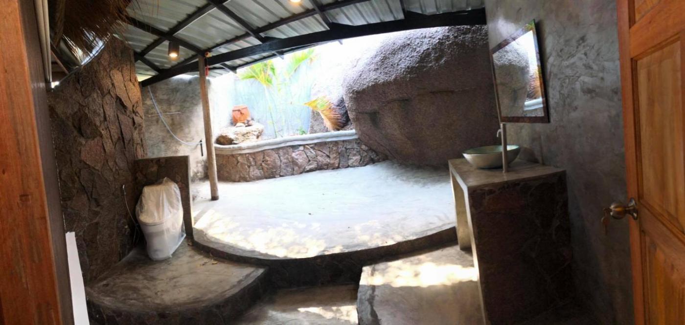 Constructed from natural materials,bungalows come with a fan and a spacious patio. The open-air bathroom features an outdoor shower and toilet.